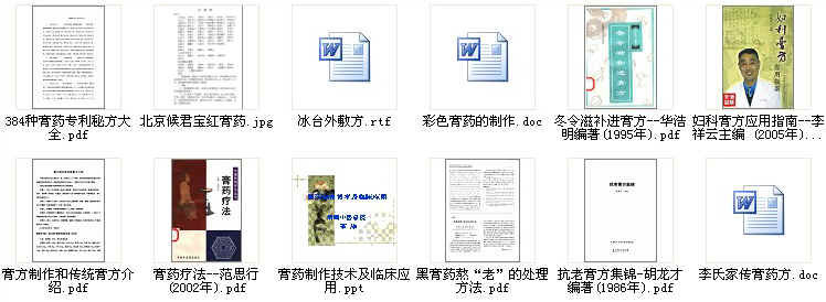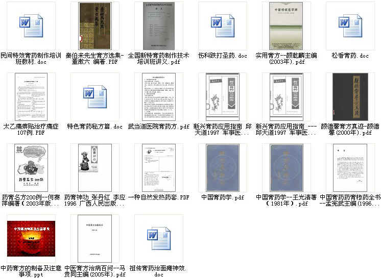 二、《药膏神功》 目录:一、绪言:1古代药膏的特点2药膏的制作和用法3药膏中毒烈药物详注4注意事项 二、药膏配方和功效:1护肤及口脂类2养生延年益寿类3冻疮类4痔漏类5烧烫伤类6疮痈疔毒肿瘤类7骨折跌打损伤类8面瘫类9偏瘫类10风湿类11疟疾类12乳房包块类13头昏头痛类14眼病类15视力障碍类16美容去瘢类17养发生发类18听力障碍类19壮腰补肾类20肢体疼痛类21皮肤斑疹类22麻风病类23白癜风类24腋臭类25慢性咳喘类26安神定志类27产后调养类 三、《膏药膏方制作大全》 本资料膏药易学易做,视频操作有纸质讲义详细的图片和文字对照,看了在10-20分钟就基本会操作了。教学函授培训资料:刘氏刘涛唐式侯国文手工黑膏药熬制工艺/刘氏膏药、侯国文膏药、唐氏膏药制作培训视频专辑/姚氏膏药特效膏药制作及配方学习(无铅膏药、穴位贴膏药、弹性膏药、液体膏药、彩色膏药及黑膏药制作)/全国膏药研修班高级教材/《膏药制作及临床应用》纸质讲义(内含几十种膏药配方)/膏药熬制工艺技术及临床验方/培训班现场熬制膏药演示及秘方讲解/数十种经临床验证疗效的膏药验方/传统黑膏药的制作/传统松香膏药的制作/全国新特膏药制作技术培训班......内容太多,不再一一介绍。